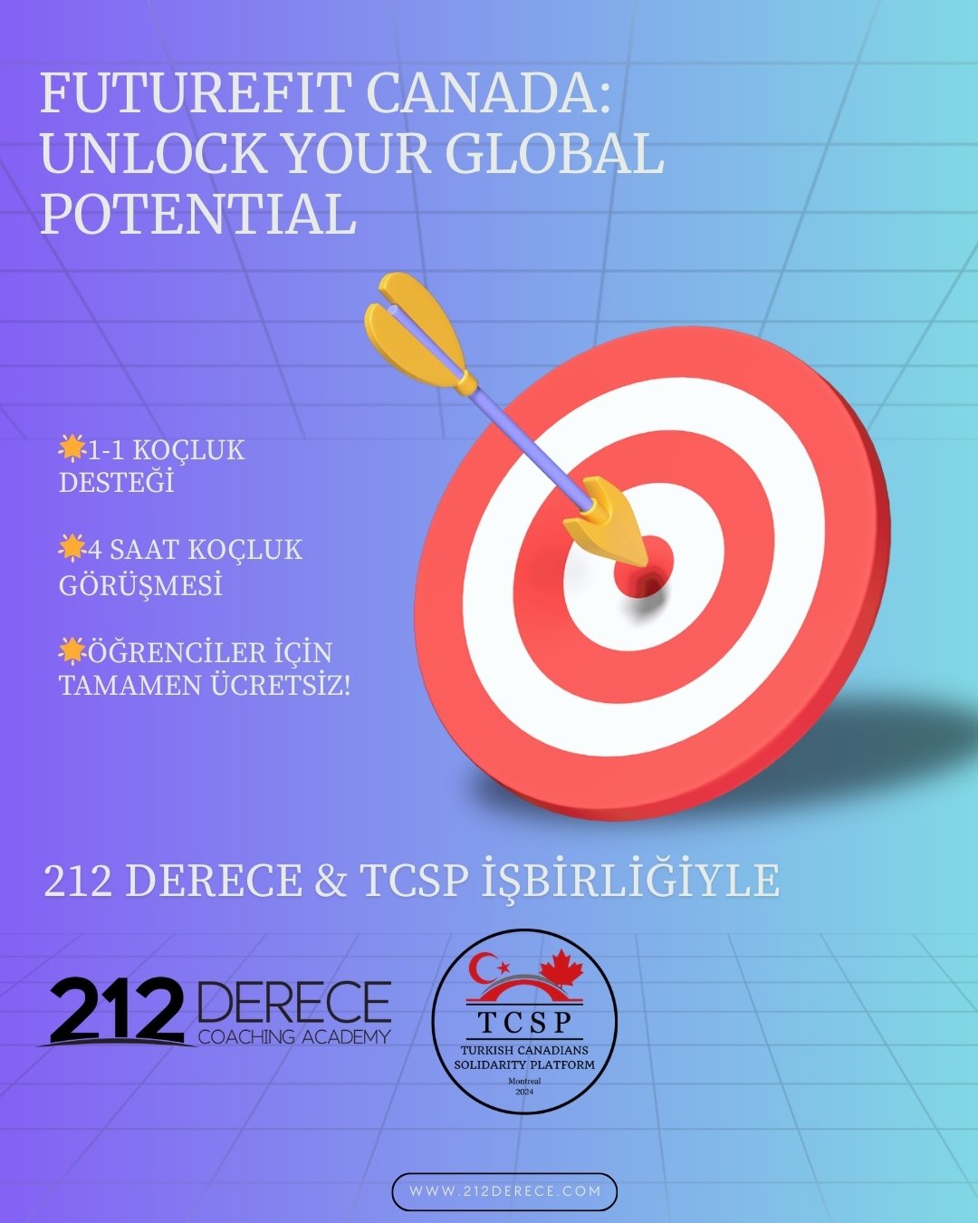 Kanadalı Türkler Dayanışma Platformu (TCSP) olarak, 212 Derece Koçluk Akademisi ile iş birliği içinde hayata geçirdiğimiz FutureFit Canada: Unlock Your Global Potential sosyal sorumluluk projesini sizlere sunmaktan mutluluk duyuyoruz.