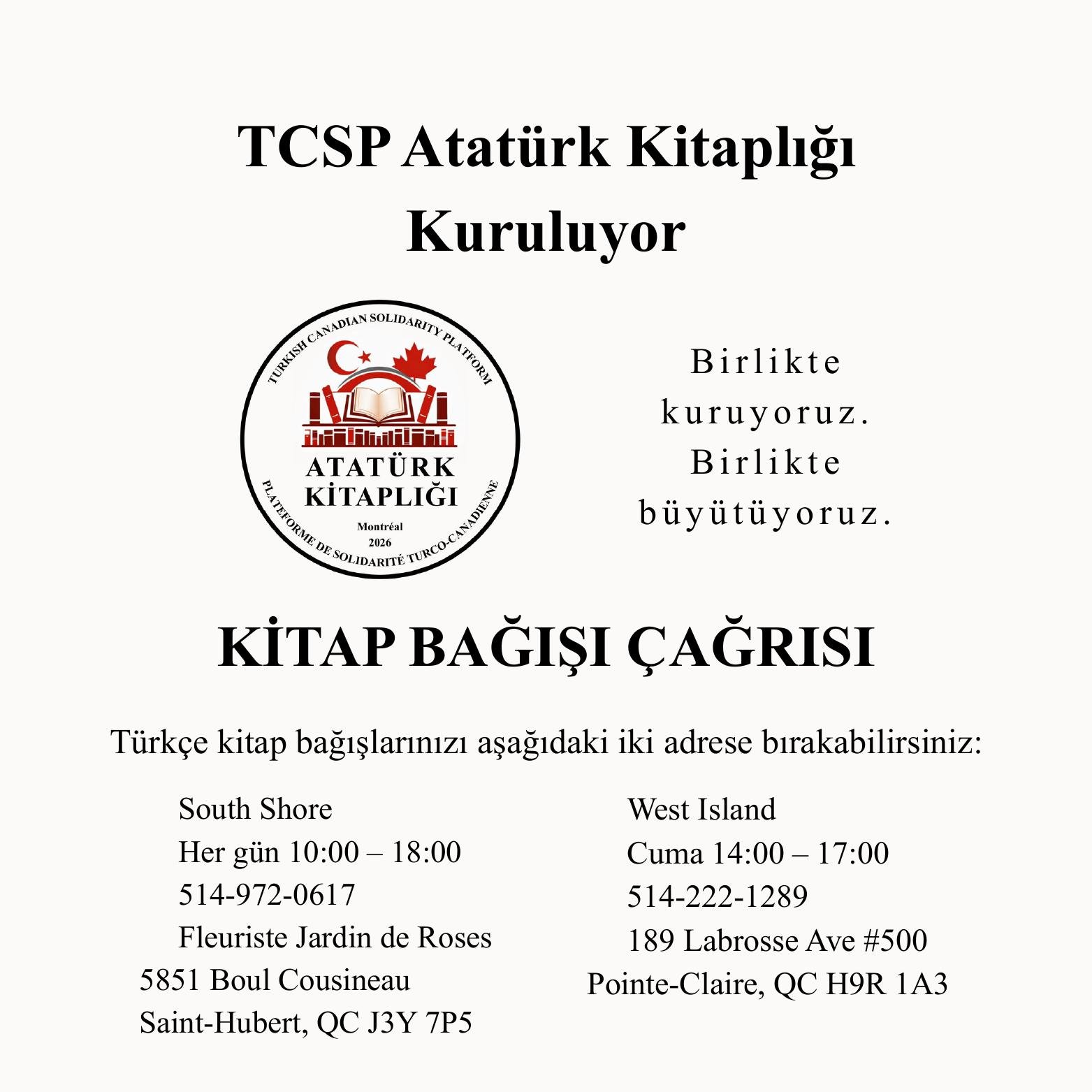 Sizlerle daha önce büyük bir mutluluk ve onurla paylaştığımız gibi Türkçe kitaplardan oluşan bir kütüphane kuruyoruz. Bu projemizi isimde küçük bir değişiklik yaparak TCSP Atatürk Kitaplığı olarak adlandırdık.